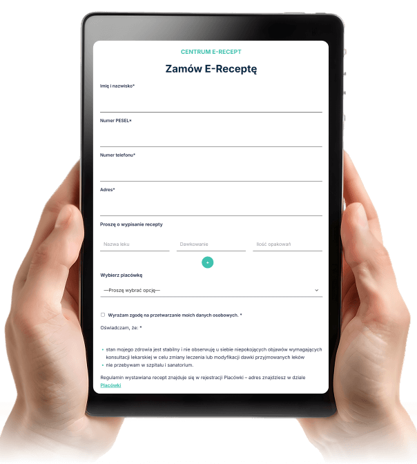 Wypełnij formularz online poniżej. Pamiętaj, aby podać wszystkie wskazane informacje. Są one niezbędne do uzyskania e-recepty.