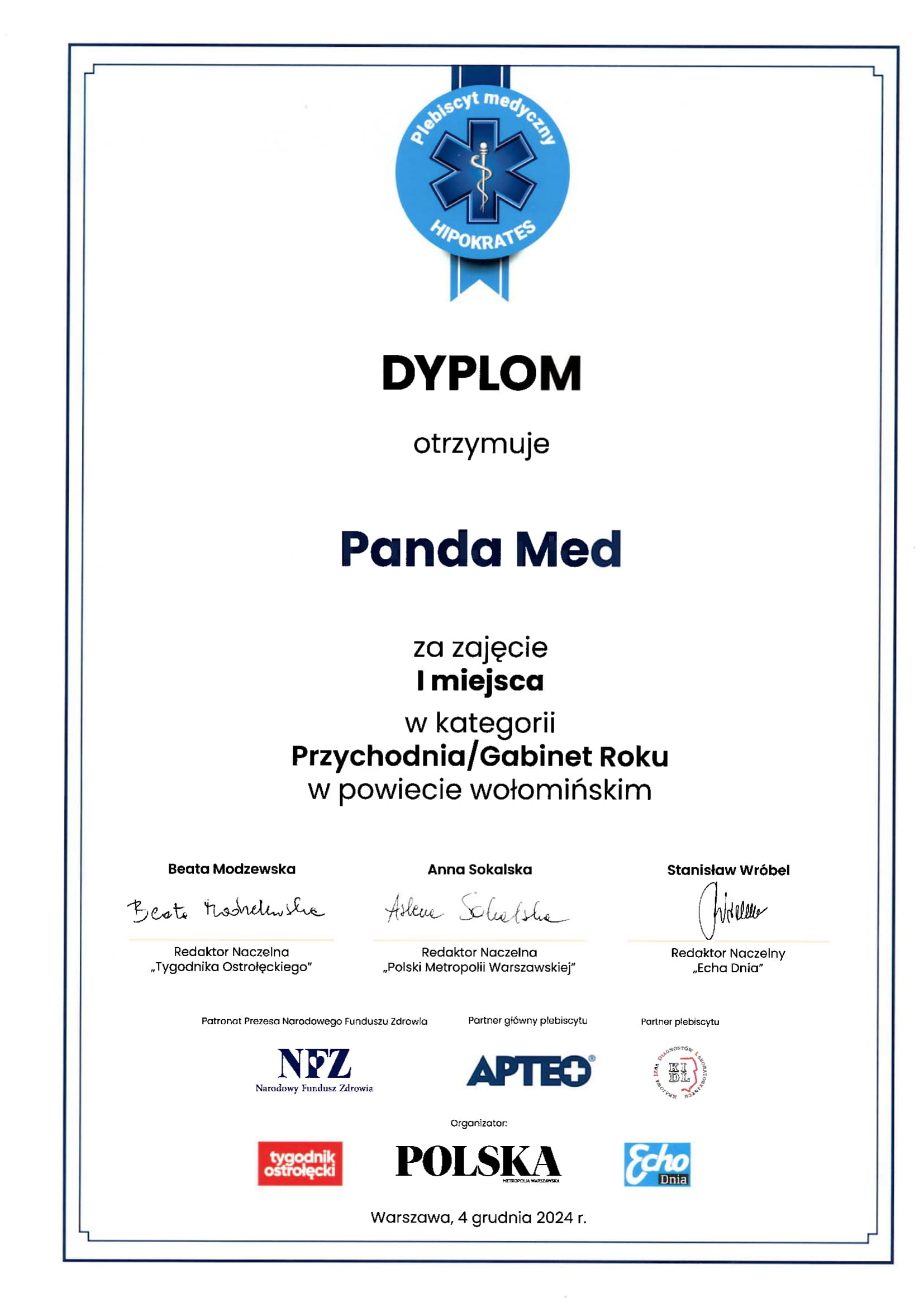 Grupa Panda Med to sieć nowoczesnych i cenionych na rynku placówek medycznych, które nieustannie podnoszą standardy opieki nad Pacjentem. Nasze zaangażowanie, profesjonalizm oraz troska o najwyższą jakość usług są regularnie doceniane przez niezależne instytucje i organizacje branżowe.